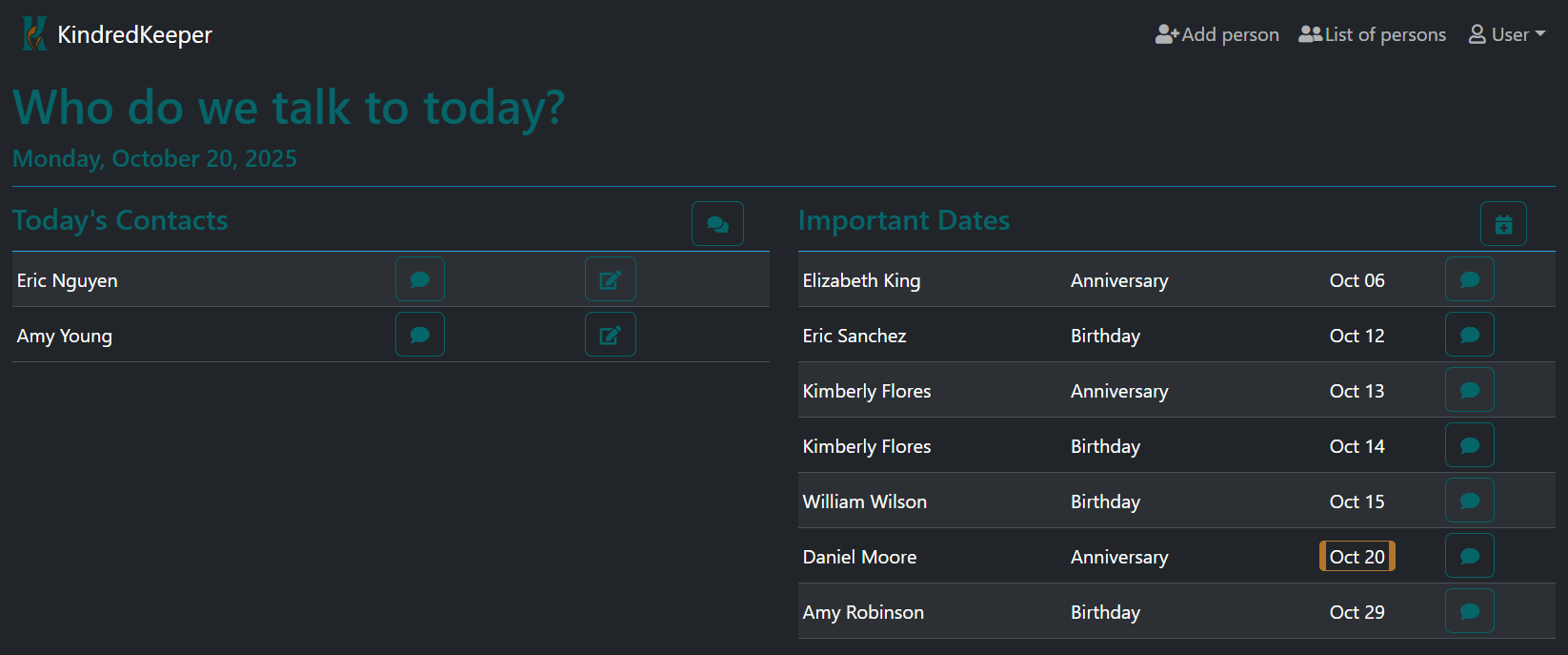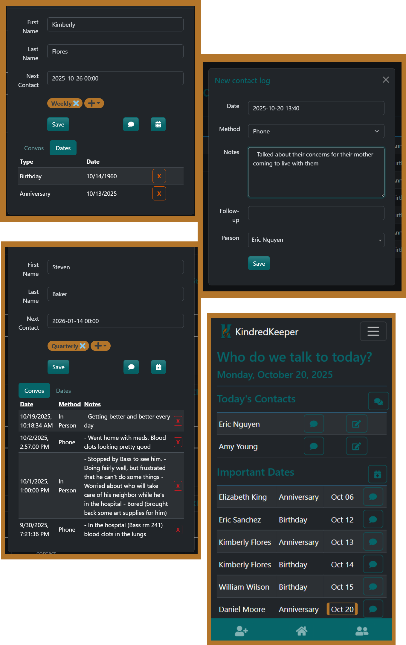 Set a custom contact frequency for each person (e.g., weekly, monthly, quarterly). KindredKeeper’s smart dashboard will show you exactly who is due for a check-in each day, so you can be proactive and consistent in your care.Remember What Matters Most